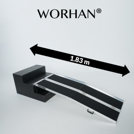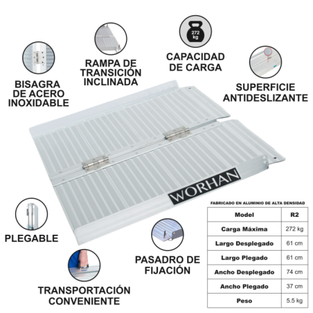 Este producto es un invento y opción ideal para los usuarios de sillas de ruedas o scooters, y un aparato adecuado para utilizar en otras ocasiones de la vida. Esta rampa/plataforma plegable 2 veces, se pliega fácilmente y es muy cómoda para llevarla en las manos, transportarla en coche y almacenarla. Aunque a simple vista no aparenta ser un objeto pequeño y liviano, su almacenamiento y transporte es especialmente cómodo gracias a su diseño único. La rampa posee un mango, se puede plegar de manera compacta y así reduce su tamaño a la mitad. Este producto ha sido fabricado de aluminio de alta calidad (y cumple con los estándares EN-131 y CE), lo que lo hace liviano, resistente, durable y provee un encanto adicional a este producto. La carga máxima admisible de todas nuestras rampas es de 272 kg. Su superficie está compuesta por ranuras con un marcado relieve que le asegurará una buena adherencia con los neumáticos de la silla de ruedas incluso en condiciones climáticas de humedad o lluvia. Este producto es resistente a los daños causados por la naturaleza, por lo tanto es durable y no le afecta el paso del tiempo. Nuestra rampa facilitará sustancialmente su vida diaria, le proporcionará importantes beneficios y superará todas las dificultades anteriores, relacionadas con su transporte y almacenamiento. Todos nuestros productos son a estrenar, certificados y embalados en fábrica.