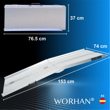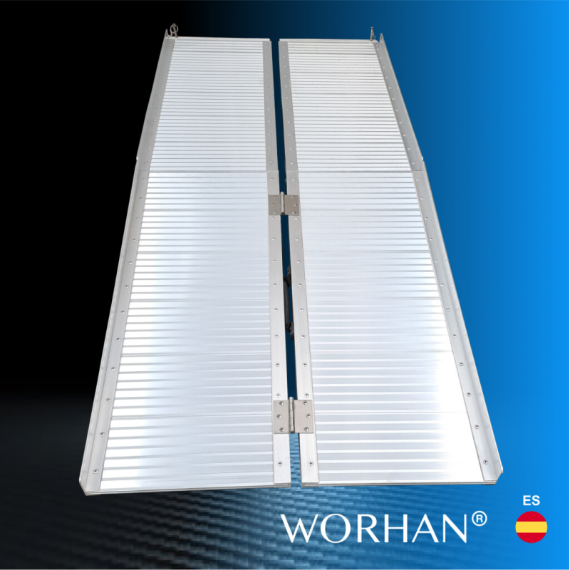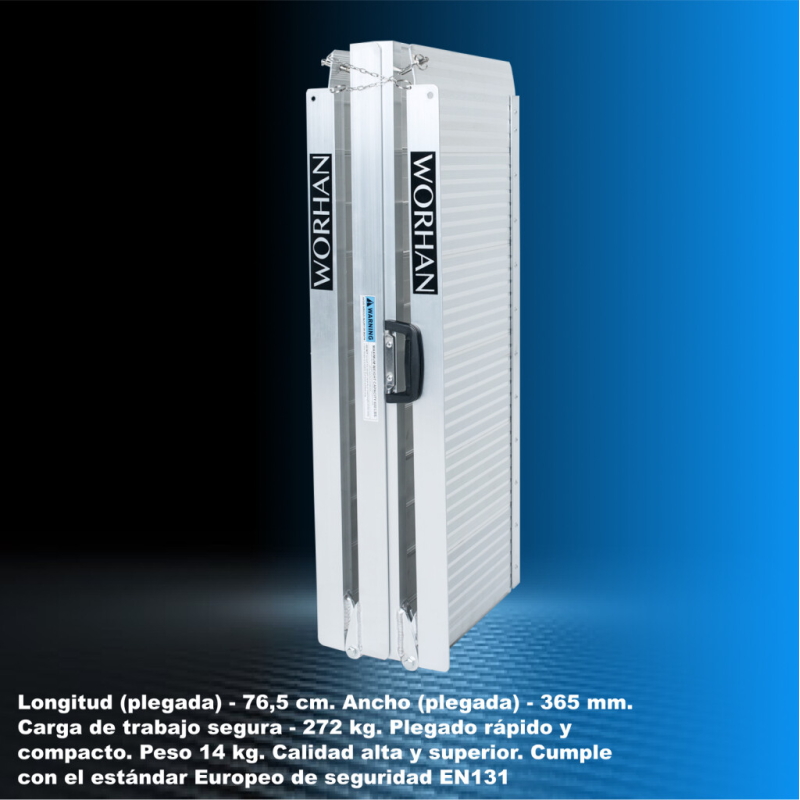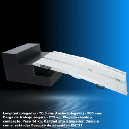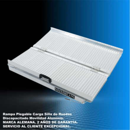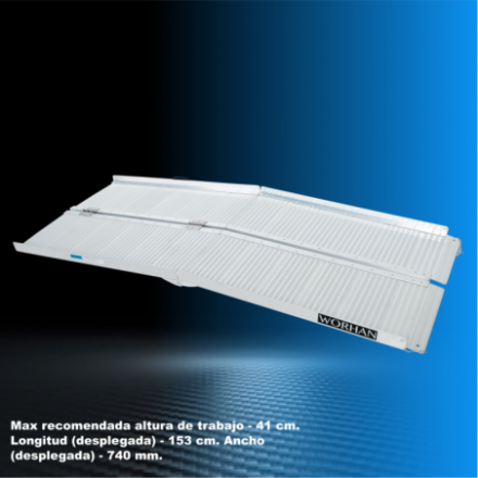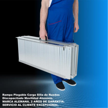 Esta rampa se pliega muy fácilmente (dos veces: en largo y ancho)., Superficie resistente y antideslizante incluso con tiempo húmedo o lluvioso., Producto duradero en el tiempo., Material: aluminio anodizado de alta calidad., Diseño optimizado, sólido y único., Muy práctico para manipulación o transporte y almacenamiento.