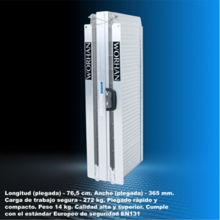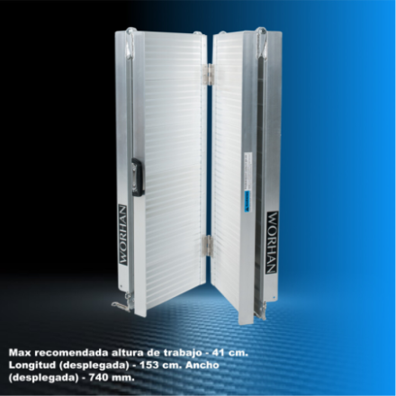 Altura máxima de trabajo recomendada: 41cm., Dimensiones: Largo desplegado: 153cm., Largo plegado: 76.5cm., Ancho desplegado: 74cm., Ancho plegado: 37cm., Peso: 13kg., Carga máxima: 300kg., Este producto está fabricado en aluminio de alta calidad (normas EN-131 y CE).