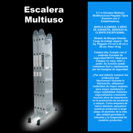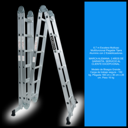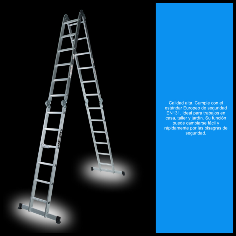 Fabricado estrictamente a las normas de seguridad Europeo EN131., Carga de trabajo segura - 150 kg., Diseño extensible y plegable para un uso versátil., Mecanismo de bloqueo fácil de usar.