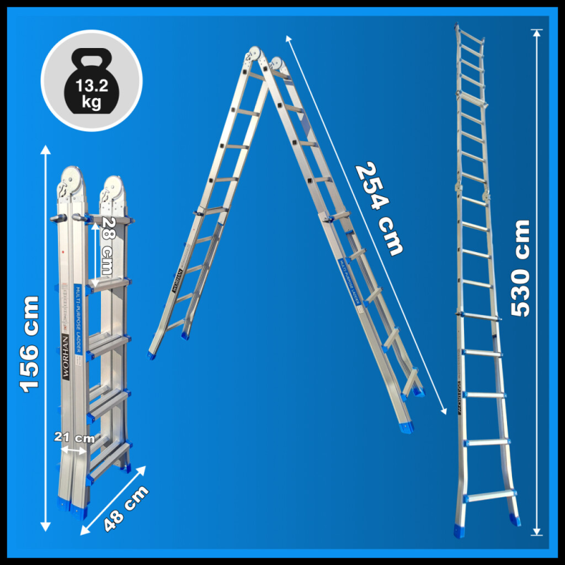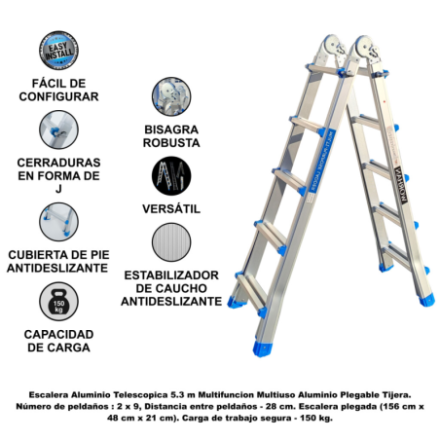 Altura: 530cm., Altura tijera: 254cm., Distancia entre peldaños: 28cm., Peldaños: 2x8., Dimensiones (plegada): 156cm x 48cm x 21cm., Peso: 13.2kg.