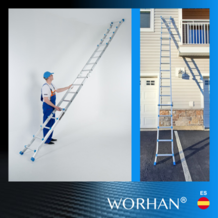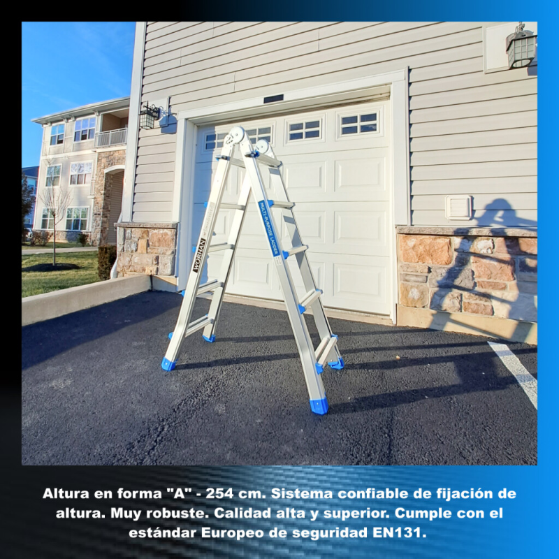 Fabricado estrictamente a las normas de seguridad Europeo EN131., Carga de trabajo segura - 150 kg., Diseño extensible y plegable para un uso versátil., El mecanismo de bloqueo seguro, simple y conveniente garantiza la facilidad de ajuste de la altura de trabajo.
