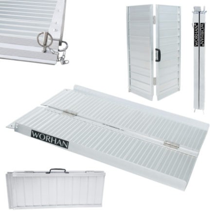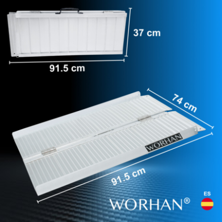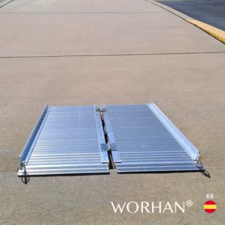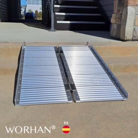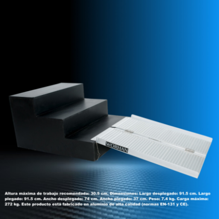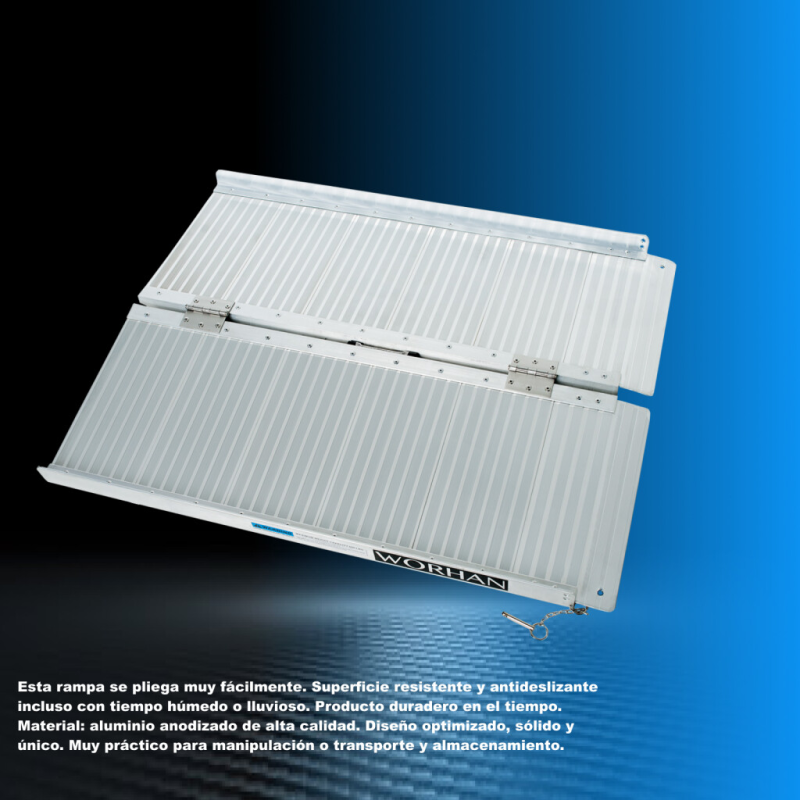 Esta rampa se pliega muy fácilmente., Superficie resistente y antideslizante incluso con tiempo húmedo o lluvioso., Producto duradero en el tiempo., Material: aluminio anodizado de alta calidad., Diseño optimizado, sólido y único., Muy práctico para manipulación o transporte y almacenamiento.