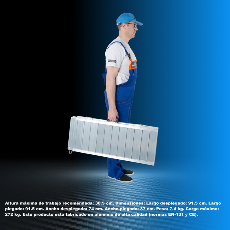 Altura máxima de trabajo recomendada: 30.5cm., Dimensiones: Largo desplegado: 91.5cm., Largo plegado: 91.5cm., Ancho desplegado: 74cm., Ancho plegado: 37cm., Peso: 7.4kg., Carga máxima: 300kg., Este producto está fabricado en aluminio de alta calidad (normas EN-131 y CE).