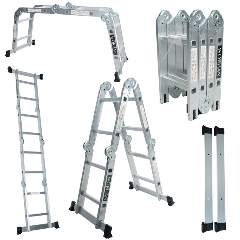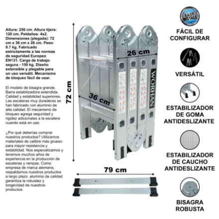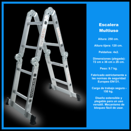 Fabricado estrictamente a las normas de seguridad Europeo EN131., Carga de trabajo segura - 150 kg., Diseño extensible y plegable para un uso versátil., Mecanismo de bloqueo fácil de usar.
