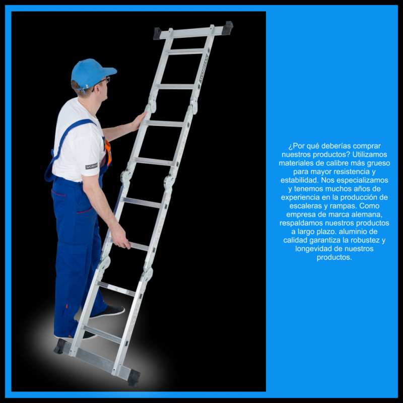 ¿Por qué deberías comprar nuestros productos? Utilizamos materiales de calibre más grueso para mayor resistencia y estabilidad. Nos especializamos y tenemos muchos años de experiencia en la producción de escaleras y rampas. Como empresa de marca alemana, respaldamos nuestros productos a largo plazo. aluminio de calidad garantiza la robustez y longevidad de nuestros productos.