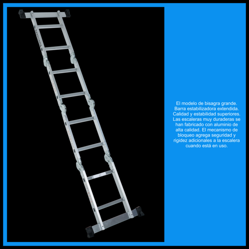 El modelo de bisagra grande., Barra estabilizadora extendida., Calidad y estabilidad superiores., Las escaleras muy duraderas se han fabricado con aluminio de alta calidad., El mecanismo de bloqueo agrega seguridad y rigidez adicionales a la escalera cuando está en uso.