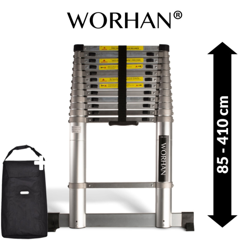 Cumple con el estándar Europeo de seguridad EN131. Carga de trabajo segura - 150 kg. Sistema confiable de fijación de alturaEsta es una escalera multifuncional de nueva generación sin análogos en el mercado. Por su novedosa tecnología no solo se caracteriza por cualidades perfectas para el transporte y almacenamiento, pero además puede reemplazar más de una variedad de escaleras corrientes.El secreto de este éxito radica en el hecho de que la calidad es perfecto y que todos los aspectos de la seguridad, el transporte, la comodidad, la maniobrabilidad se tomaron en cuenta para satisfacer a todos los usuarios independientemente de las tareas. Por lo tanto, se puede utilizar tanto para las tareas domésticas en las obras . Esta escalera de aluminio se fabrica con las más novedosas tecnologías y aluminio de la más alta calidad, lo cual ayuda a garantizar una larga vida útil y estabilidad en el ambiente laboral.Con la opción de cambiar rápidamente la longitud de la escalera. Los pies de goma de la escalera garantizan la seguridad de las superficies sobre las cuales se trabaja y una buena adhesión entre la escalera y la superficie. El sistema de bloqueo seguro, único, simple, fácil de usar, se puede utilizar por todosVentajas:*Carga de trabajo segura - 150 kg.*Cumple con el estándar Europeo de seguridad EN131.*Con la opción de cambiar rápidamente la longitud de la escalera.*Los pies de goma de la escalera garantizan la seguridad de las superficies sobre las cuales se trabaja y una buena adhesión entre la escalera y la superficie.*El sistema de bloqueo seguro, único, simple, fácil de usar, se puede utilizar por todos.Dimensiones:Altura : 4.1m (totalmente extendidas)Dimensiones (plegada): 92 x 47 x 10 cm.Peldaños : 14Peso 12.2 kgLongitud del estabilizador – 77cm