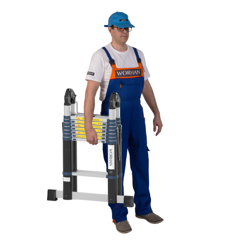 Escalera telescópica doble WORHAN *** Línea C: escaleras telescópicas dobles de calidad que cumplen con todos los requisitos de seguridad y más adecuadas para uso amateur.***** Línea B: escaleras telescópicas dobles de calidad que cumplen con todos los requisitos de seguridad. Debido a que la escalera está equipada con 2 estabilizadores, brinda mejor estabilidad cuando se usa en la posición "A" o completamente extendida. ***** Línea A: estas son las escaleras telescópicas dobles más altas que fabricamos. En la fase de producción, se ha hecho hincapié en la mejora de la seguridad, la durabilidad y la máxima estabilidad, especialmente cuando se trabaja en altura. Recomendamos estas escaleras para uso diario y constante a profesionales y aficionados.