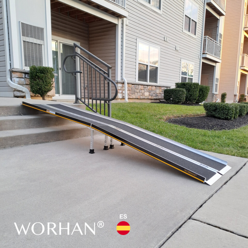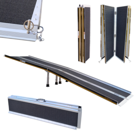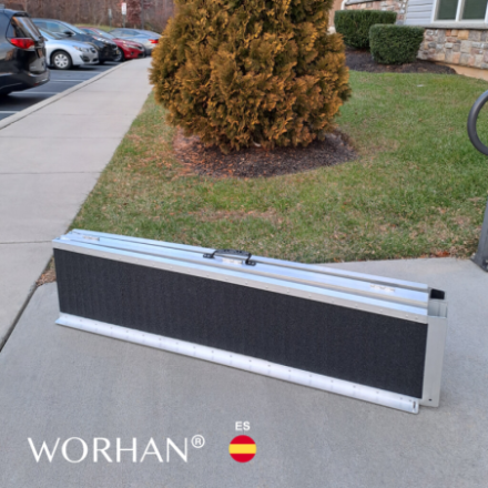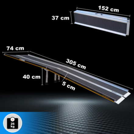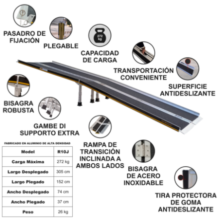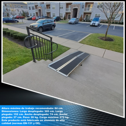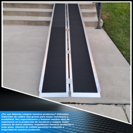 Función antideslizante aumentada., Esta rampa se pliega muy fácilmente (dos veces: en largo y ancho)., Superficie resistente y EXTRA antideslizante incluso con tiempo húmedo o lluvioso., Producto duradero en el tiempo., Material: aluminio anodizado de alta calidad., Diseño optimizado, sólido y único., Muy práctico para manipulación o transporte y almacenamiento.
