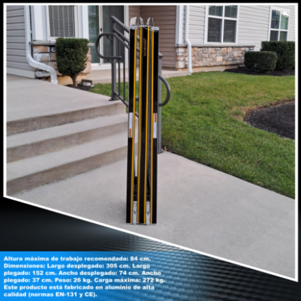Altura máxima de trabajo recomendada: 84cm., Dimensiones: Largo desplegado: 305cm., Largo plegado: 152cm., Ancho desplegado: 74cm., Ancho plegado: 37cm., Peso: 26.2kg., Carga máxima: 300kg., Este producto está fabricado en aluminio de alta calidad (normas EN-131 y CE).