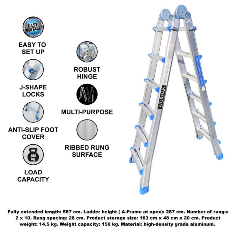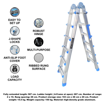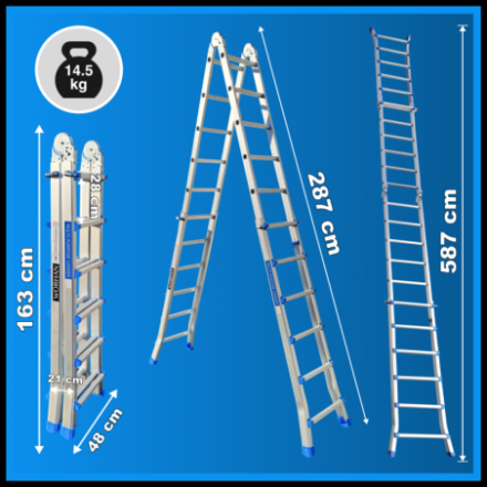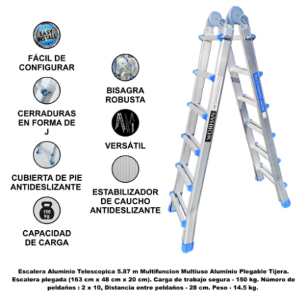 Altura: 587cm., Altura tijera: 287cm., Distancia entre peldaños: 28cm., Peldaños: 2x10., Dimensiones (plegada): 163cm x 48cm x 20cm., Peso: 14.5kg.