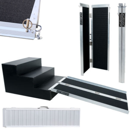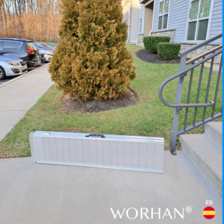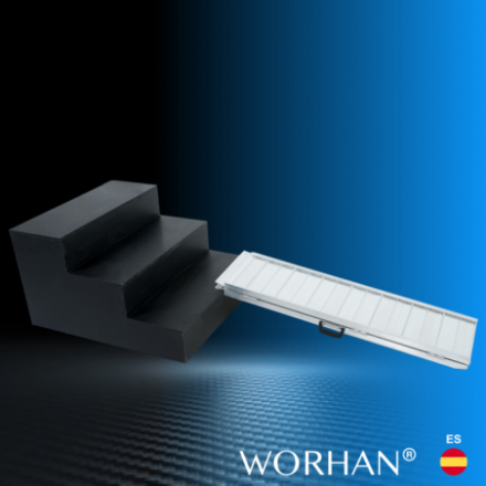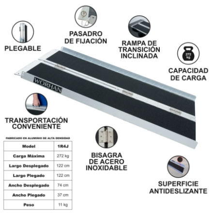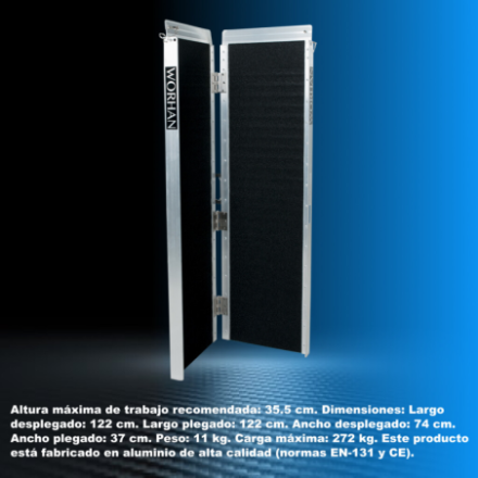 Función antideslizante aumentada., Esta rampa se pliega muy fácilmente., Superficie resistente y EXTRA antideslizante incluso con tiempo húmedo o lluvioso., Producto duradero en el tiempo., Material: aluminio anodizado de alta calidad., Diseño optimizado, sólido y único., Muy práctico para manipulación o transporte y almacenamiento.