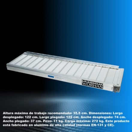Altura máxima de trabajo recomendada: 35.5cm., Dimensiones: Largo desplegado: 122cm., Largo plegado: 122cm., Ancho desplegado: 74cm., Ancho plegado: 37cm., Peso: 11.1kg., Carga máxima: 300kg., Este producto está fabricado en aluminio de alta calidad (normas EN-131 y CE).