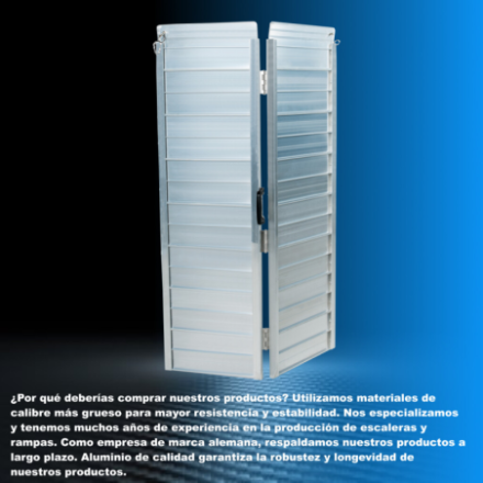 ¿Por qué deberías comprar nuestros productos? Utilizamos materiales de calibre más grueso para mayor resistencia y estabilidad. Nos especializamos y tenemos muchos años de experiencia en la producción de escaleras y rampas. Como empresa de marca alemana, respaldamos nuestros productos a largo plazo. aluminio de calidad garantiza la robustez y longevidad de nuestros productos.