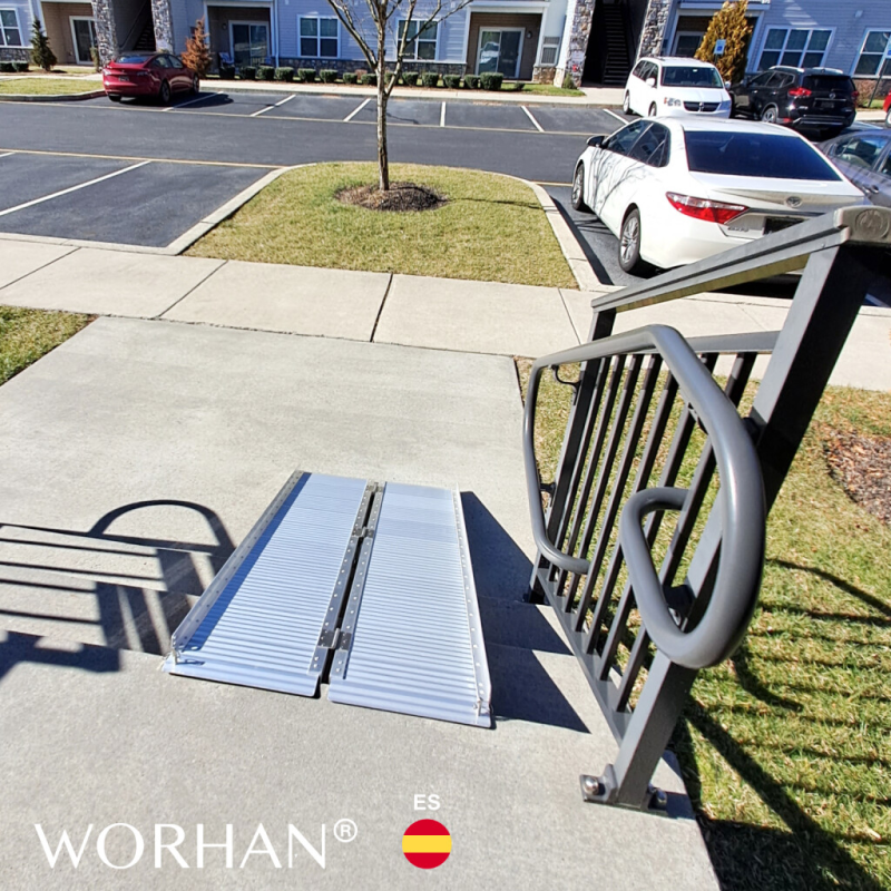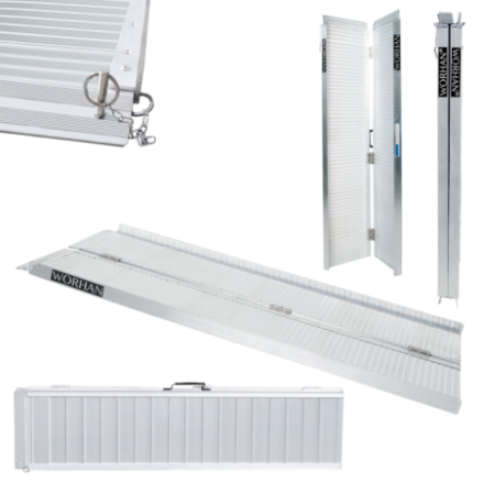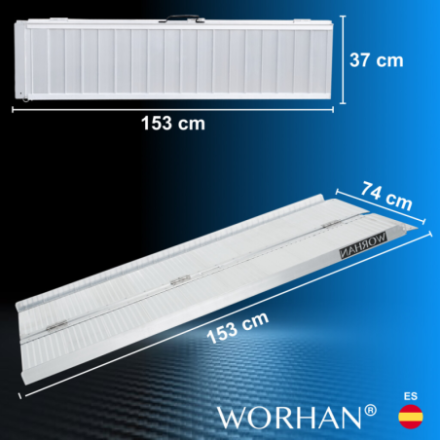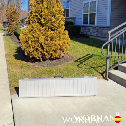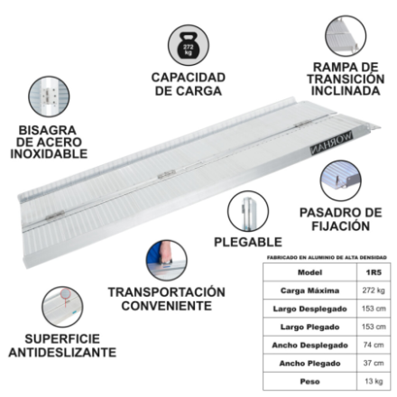 Esta rampa se pliega muy fácilmente., Superficie resistente y antideslizante incluso con tiempo húmedo o lluvioso., Producto duradero en el tiempo., Material: aluminio anodizado de alta calidad., Diseño optimizado, sólido y único., Muy práctico para manipulación o transporte y almacenamiento.