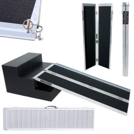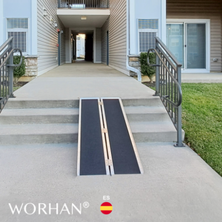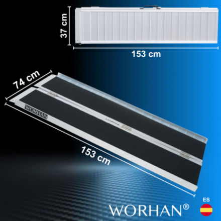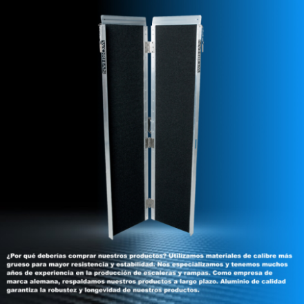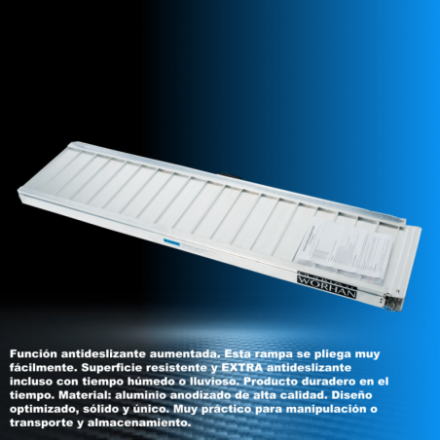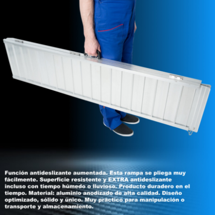 Función antideslizante aumentada., Esta rampa se pliega muy fácilmente., Superficie resistente y EXTRA antideslizante incluso con tiempo húmedo o lluvioso., Producto duradero en el tiempo., Material: aluminio anodizado de alta calidad., Diseño optimizado, sólido y único., Muy práctico para manipulación o transporte y almacenamiento.