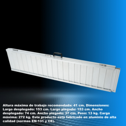 Altura máxima de trabajo recomendada: 41cm., Dimensiones: Largo desplegado: 153cm., Largo plegado: 153cm., Ancho desplegado: 74cm., Ancho plegado: 37cm., Peso: 13kg., Carga máxima: 300kg., Este producto está fabricado en aluminio de alta calidad (normas EN-131 y CE).