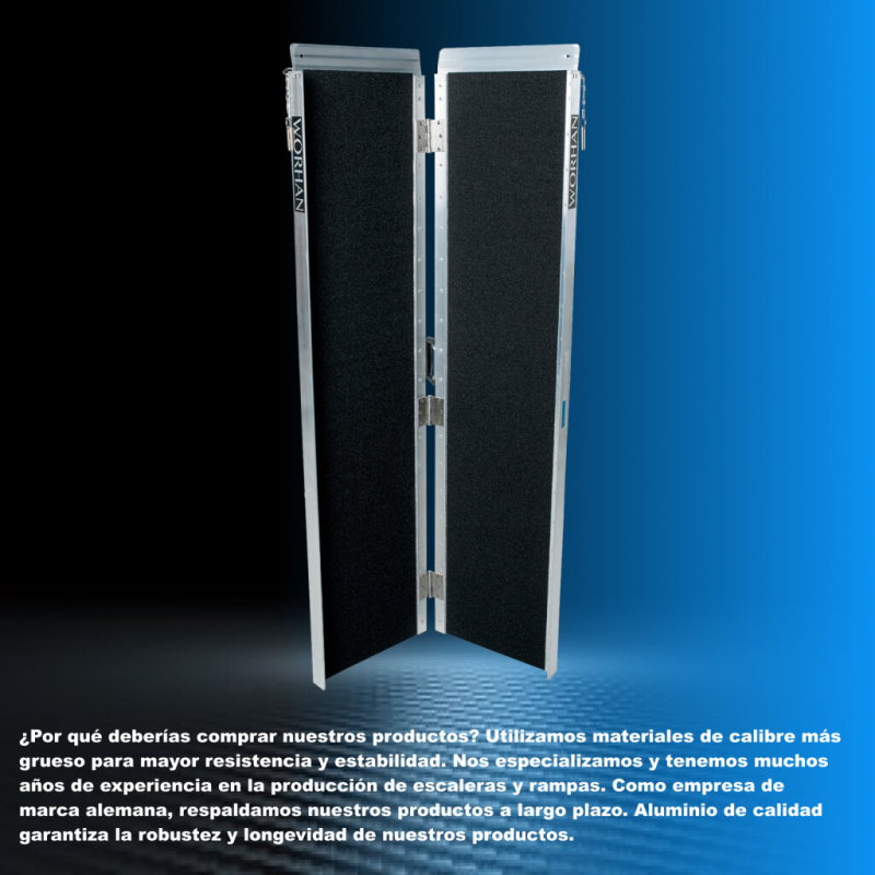 ¿Por qué deberías comprar nuestros productos? Utilizamos materiales de calibre más grueso para mayor resistencia y estabilidad. Nos especializamos y tenemos muchos años de experiencia en la producción de escaleras y rampas. Como empresa de marca alemana, respaldamos nuestros productos a largo plazo. aluminio de calidad garantiza la robustez y longevidad de nuestros productos.