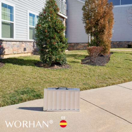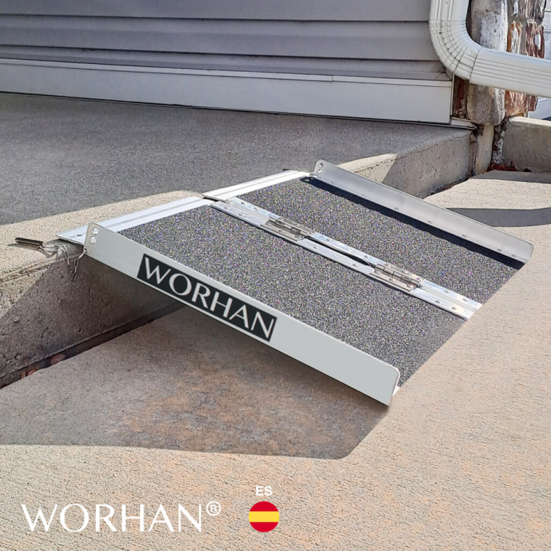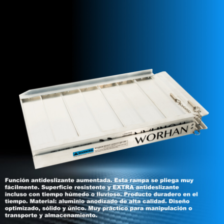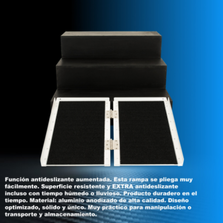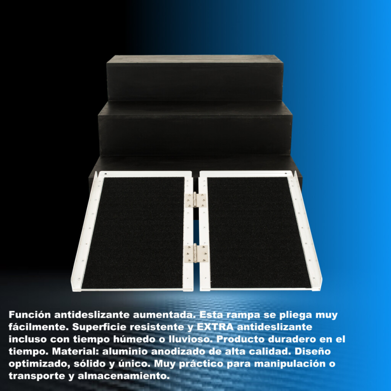 Función antideslizante aumentada., Esta rampa se pliega muy fácilmente., Superficie resistente y EXTRA antideslizante incluso con tiempo húmedo o lluvioso., Producto duradero en el tiempo., Material: aluminio anodizado de alta calidad., Diseño optimizado, sólido y único., Muy práctico para manipulación o transporte y almacenamiento.