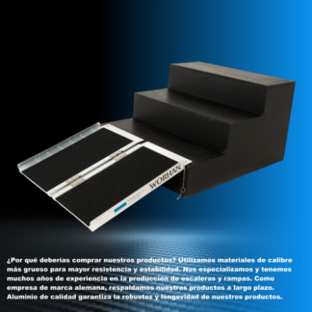 ¿Por qué deberías comprar nuestros productos? Utilizamos materiales de calibre más grueso para mayor resistencia y estabilidad. Nos especializamos y tenemos muchos años de experiencia en la producción de escaleras y rampas. Como empresa de marca alemana, respaldamos nuestros productos a largo plazo. aluminio de calidad garantiza la robustez y longevidad de nuestros productos.