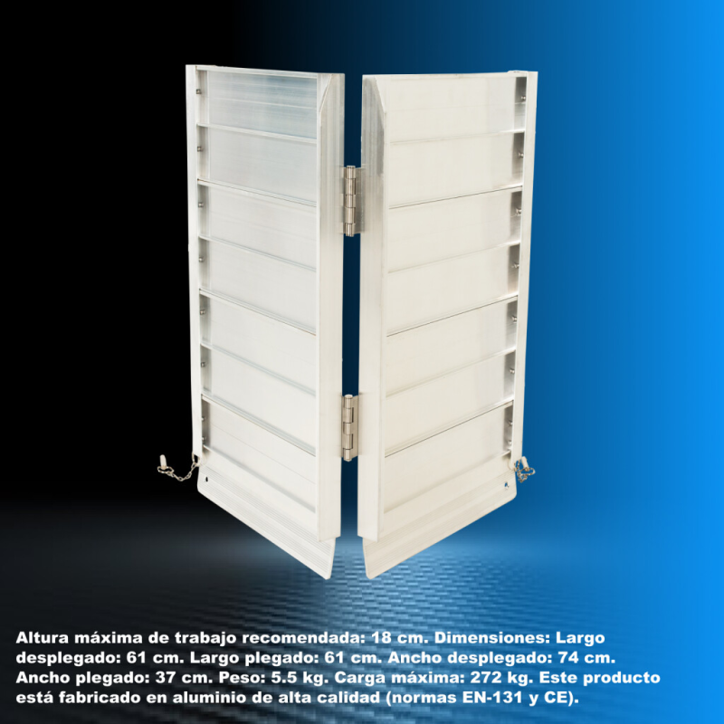 Altura máxima de trabajo recomendada: 18cm., Dimensiones: Largo desplegado: 61cm., Largo plegado: 61cm., Ancho desplegado: 74cm., Ancho plegado: 37cm., Peso: 5.6kg., Carga máxima: 300kg., Este producto está fabricado en aluminio de alta calidad (normas EN-131 y CE).
