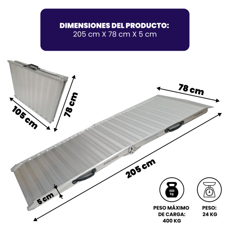 Dimensiones: * Longitud desplegada: 205cm * Longitud plegada: 105cm * Ancho: 78cm * Peso: 24kg * Dimensiones cuando se pliega - 105cm x 13cm x 78cm