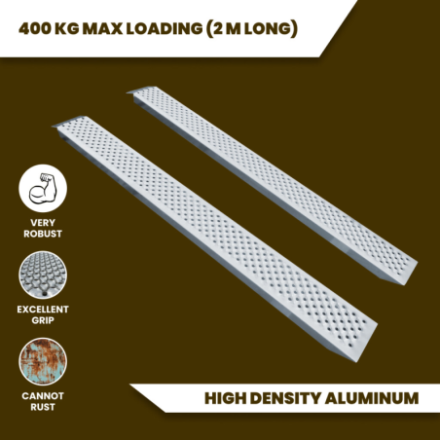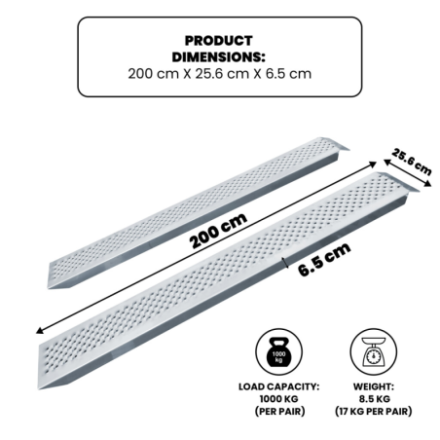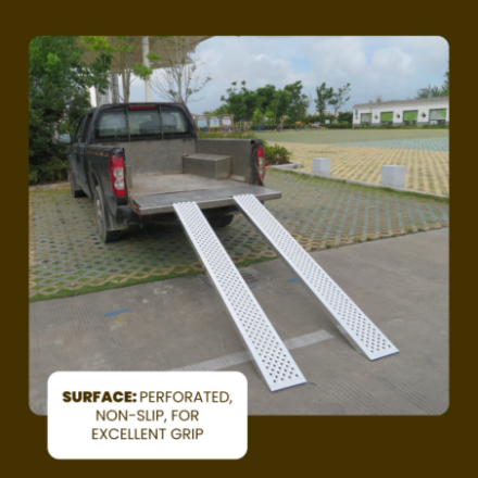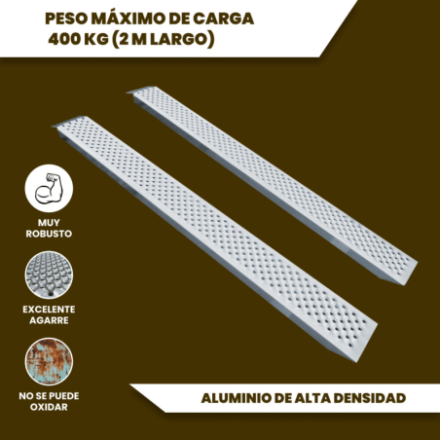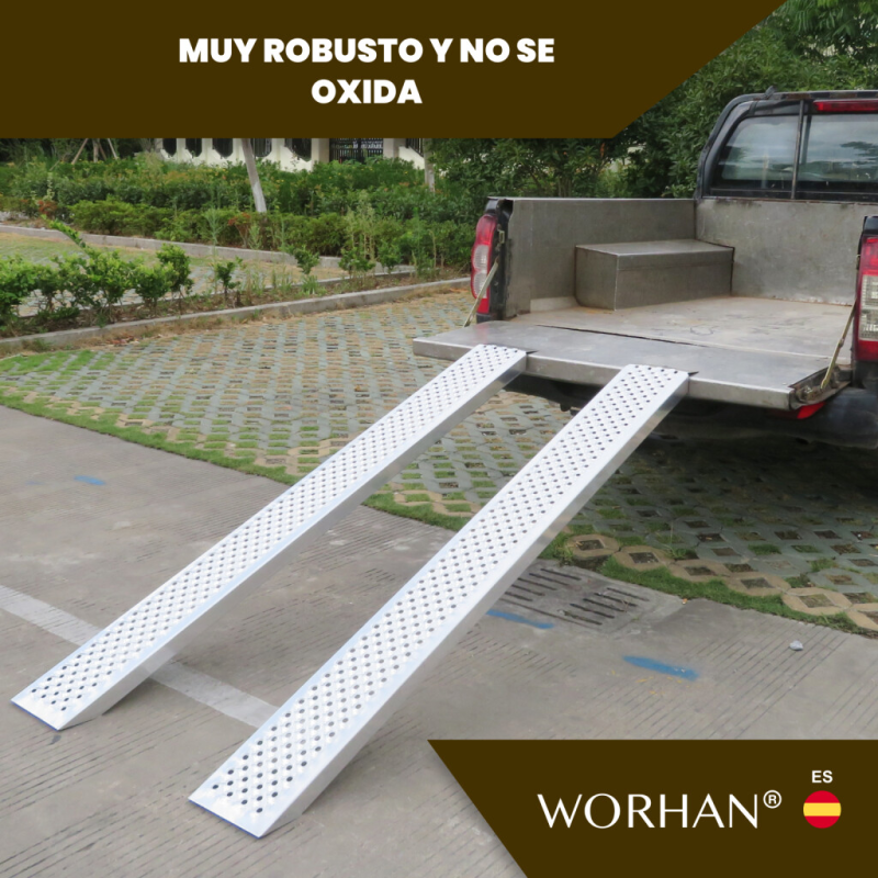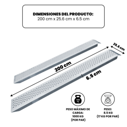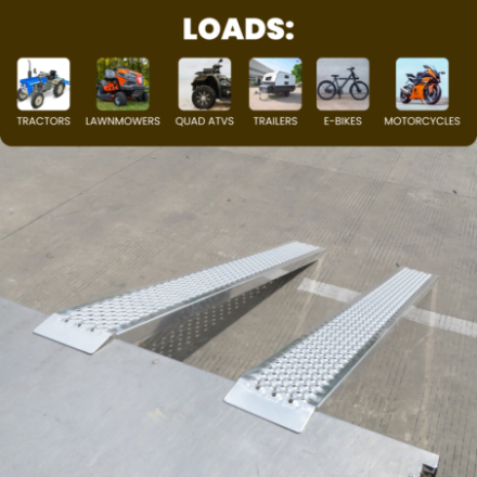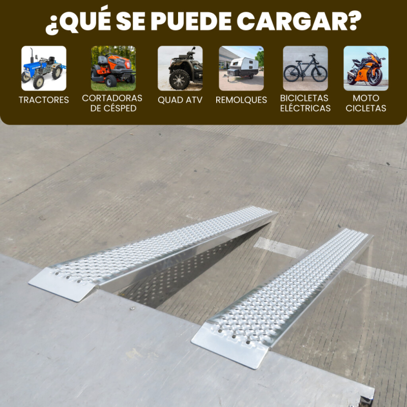 Las rampas se pueden utilizar para cargar tractores o cortadoras de césped, quads, remolques, bicicletas eléctricas, motocicletas, etc. Bordes laterales biselados para garantizar un mayor contacto en el punto de apoyo superior.