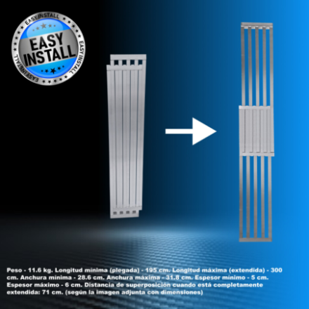 Peso: 11,6 kg., Longitud mínima (plegada): 195 cm, Longitud máxima (extendida): 300 cm, Ancho mínimo: 28,6 cm, Ancho máximo: 31,8 cm, Grosor mínimo: 5 cm, Grosor máximo: 6 cm. Distancia de superposición cuando está completamente extendida: 71 cm. (según imagen adjunta con dimensiones)