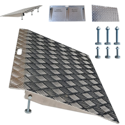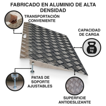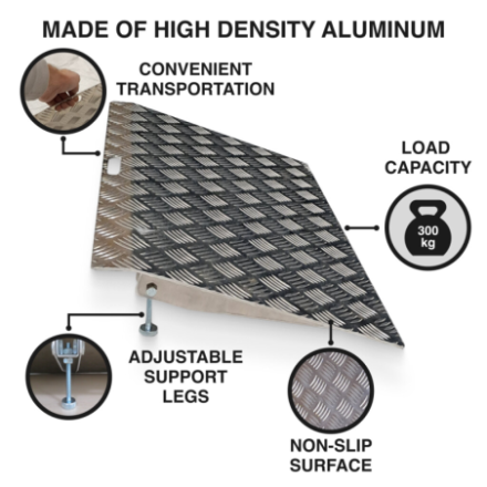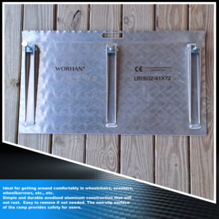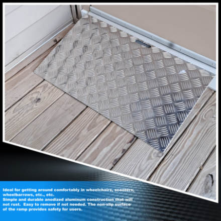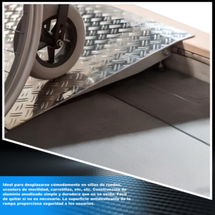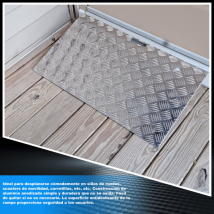 No se requiere montaje. Ideal para moverse cómodamente en sillas de ruedas, scooters, carretillas, etc., etc. Construcción de aluminio anodizado simple y duradero que no se oxida. Fácil de quitar si es necesario. La superficie antideslizante de la rampa proporciona seguridad a los usuarios.