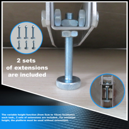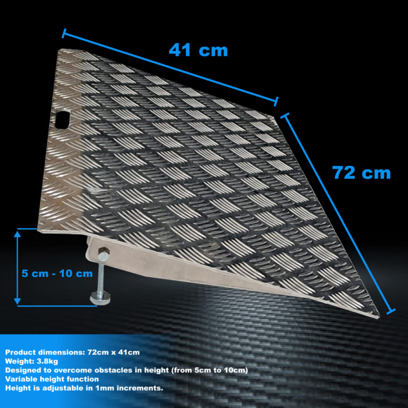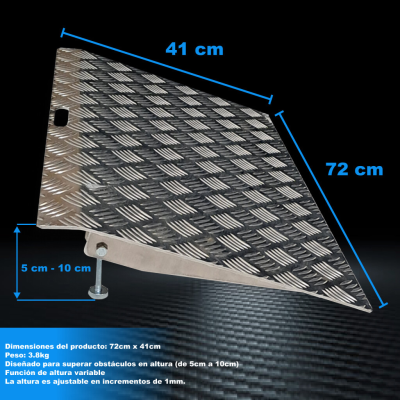 Esta rampa simplificará el cruce de obstáculos tales como: umbrales altos, cables, tuberías y otros lugares que impidan el movimiento práctico de personas o carga. La función de altura variable (de 5cm a 10cm) facilita cualquier tarea. Fabricado según normas EN-131 y CE