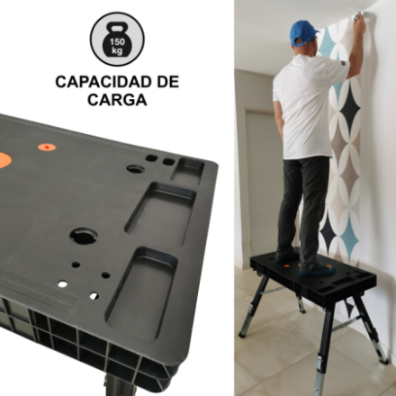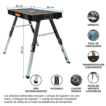 3 alturas de trabajo ajustables: a) 80cm., b) 66cm., y c) 52cm., Capacidad de carga: 150kg, Peso: 15kg, Tamaño desplegado: 129cm x 59cm x 80cm, Tamaño plegado: 94cm x 48cm x16cm,
