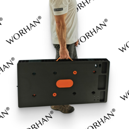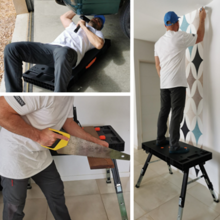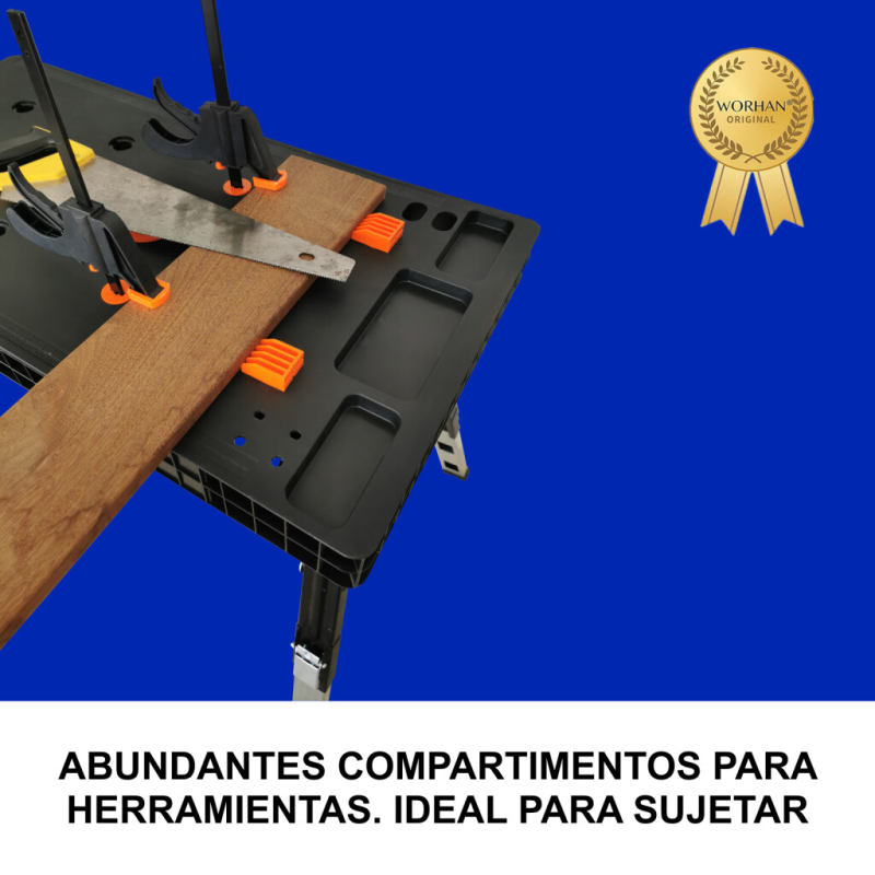 Numerosas cavidades para tornillos, tuercas, tacos y también para varias herramientas: destornilladores, alicates, etc. La regla (en 2 lados) y el transportador están grabados en la superficie de trabajo.