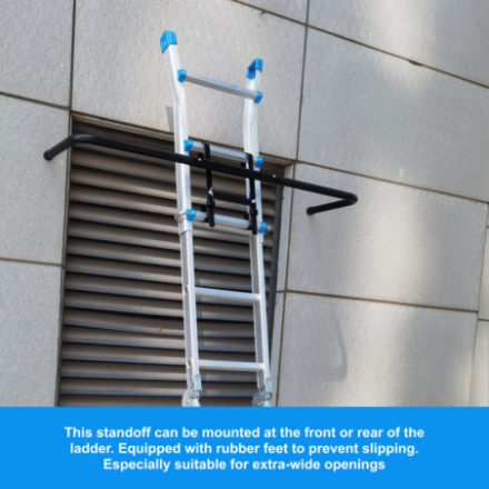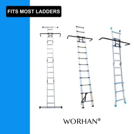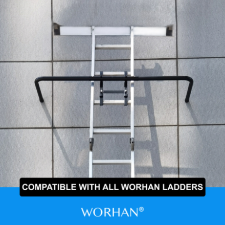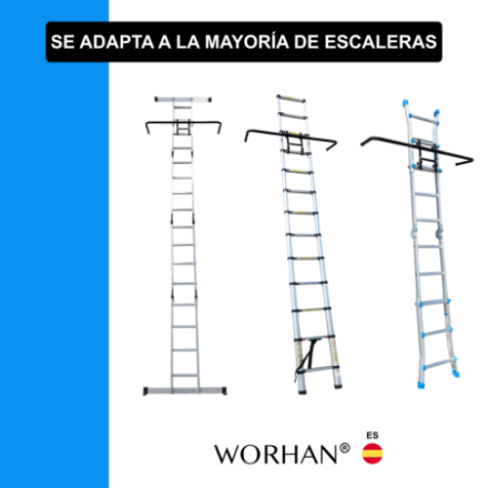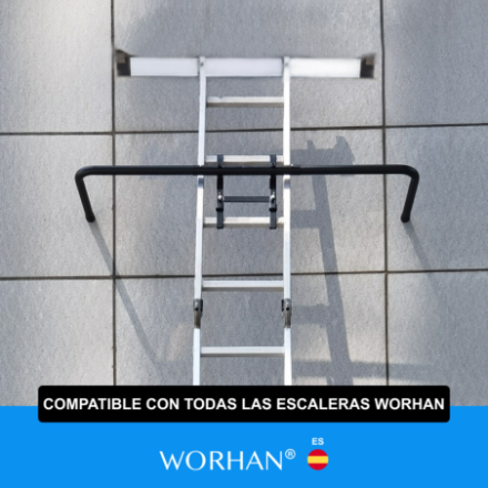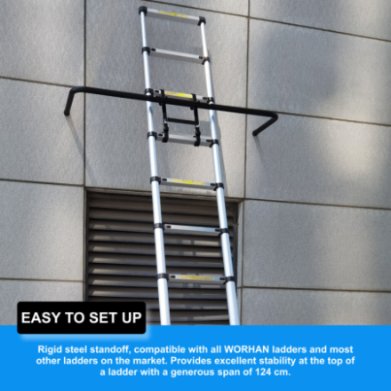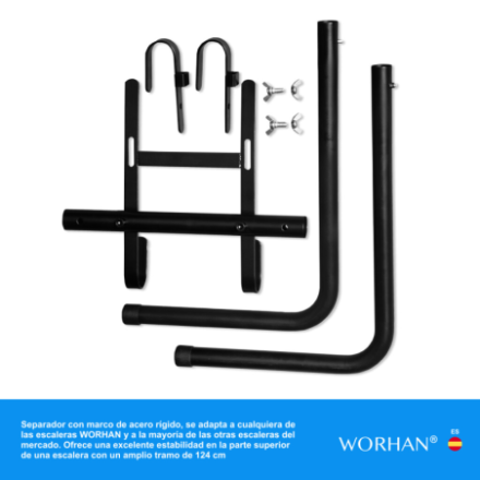 Separador con marco de acero rígido, se adapta a cualquiera de las escaleras WORHAN y a la mayoría de las otras escaleras del mercado. Ofrece una excelente estabilidad en la parte superior de una escalera con un amplio tramo de 124 cm