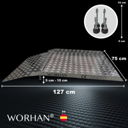 Esta rampa facilita el cruce de obstáculos como: umbrales altos, cables, tuberías y otros lugares que impiden el movimiento práctico de personas o carga., La función de altura variable (de 5cm a 15cm) facilita cada tarea., 2 juegos de las extensiones están incluidas., Para una altura mínima, la plataforma debe usarse sin extensiones., Fabricado según las normas EN-131 y CE