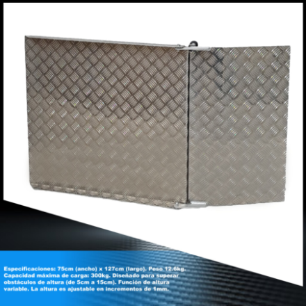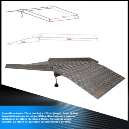 Especificaciones: 75cm (ancho) x 127cm (largo). Peso 12.6kg. Capacidad máxima de carga: 300kg. Diseñado para superar obstáculos de altura (de 5cm a 15cm). Función de altura variable. La altura es ajustable en incrementos de 1mm.