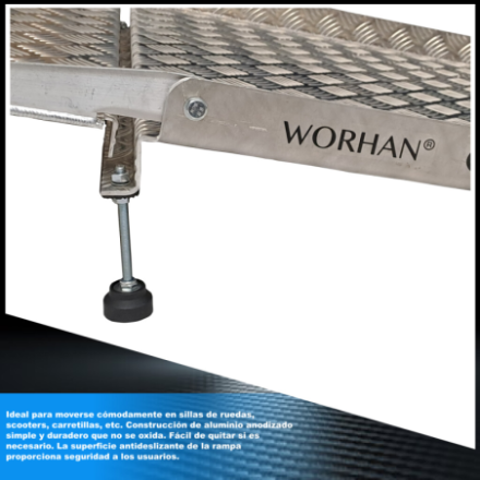 No se requiere montaje. Ideal para moverse cómodamente en sillas de ruedas, scooters, carretillas, etc. Construcción de aluminio anodizado simple y duradero que no se oxida. Fácil de quitar si es necesario. La superficie antideslizante de la rampa proporciona seguridad a los usuarios.