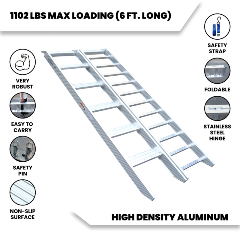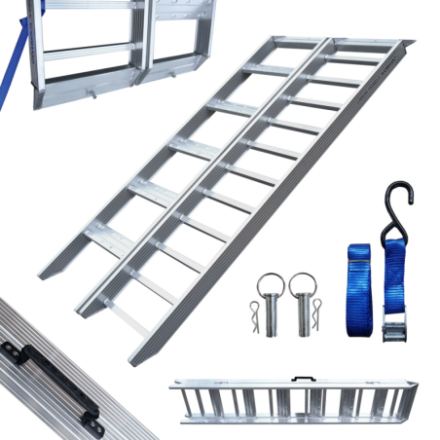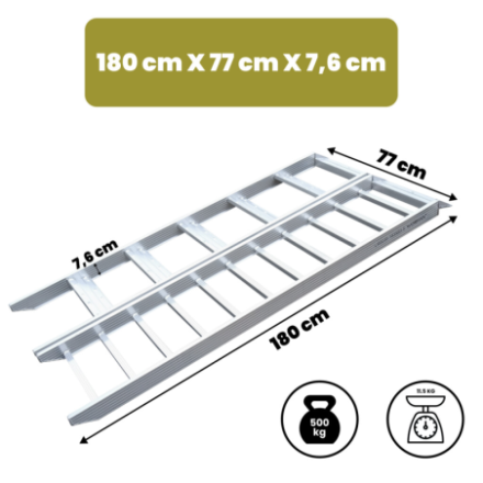Detalles técnicos: Largo: 180cm., Ancho (desplegado): 77cm., Peso: 11.5kg., Grosor de la rampa / Fondo: 7.6cm., Distancia entre pasos (centro a centro del escalón): 30cm., Profundidad del escalón: 11cm., espacio para peldaños de conducción de motocicletas: 15.5 cm., La rampa está diseñada para soportar un peso de 500kg (este es un peso total combinado de la persona y la motocicleta). Los procedimientos de soldadura de alta precisión y calidad garantizan la longevidad del producto.