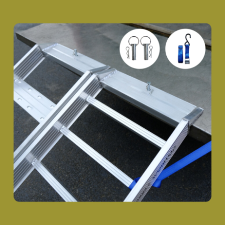 Precauciones de seguridad y características de amarre: esta rampa se puede asegurar para que no se deslice mediante: a) una correa (suministrada) o mediante b) un par de pasadores metálicos que evitan el deslizamiento de la parte superior de la rampa. Cuando se prefiere la opción "b)", dependiendo de la situación, es posible que se requiera perforar 2 orificios en la superficie de soporte para insertar los pasadores de bloqueo de metal. La superficie de la rampa es antideslizante, adaptada para ser utilizada en condiciones de clima húmedo.