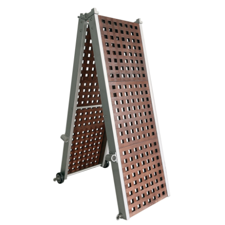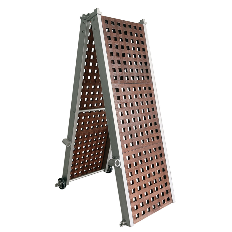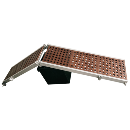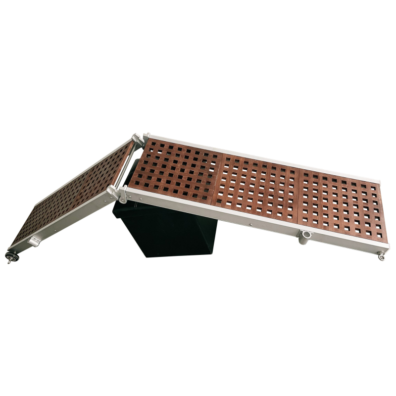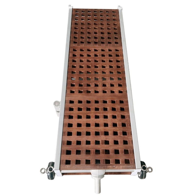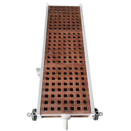 La pasarela está equipada con ruedas, toma de anclaje, y además los ojales en cada extremo de la pasarela permiten fijar la cuerda del pasamanos. (la cuerda y el pasamanos no están incluidos ).,